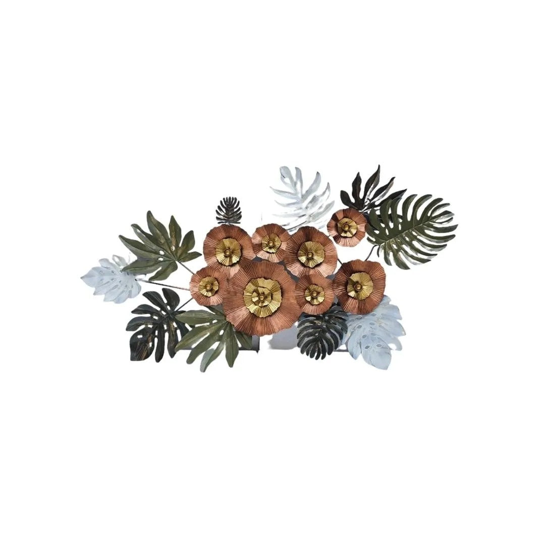 Make your walls stand out with this stunning handmade copper floral and leaf metal wall art. Featuring layered metallic flowers with ribbed detailing and oversized tropical leaves in rustic copper and gold tones, this statement piece adds luxury and warmth to any space. Measuring approximately 56×30 inches, it’s the perfect size for above a sofa, console table, or dining wall. Handcrafted from durable metal with a rustic finish, this wall art blends modern elegance with nature-inspired design.