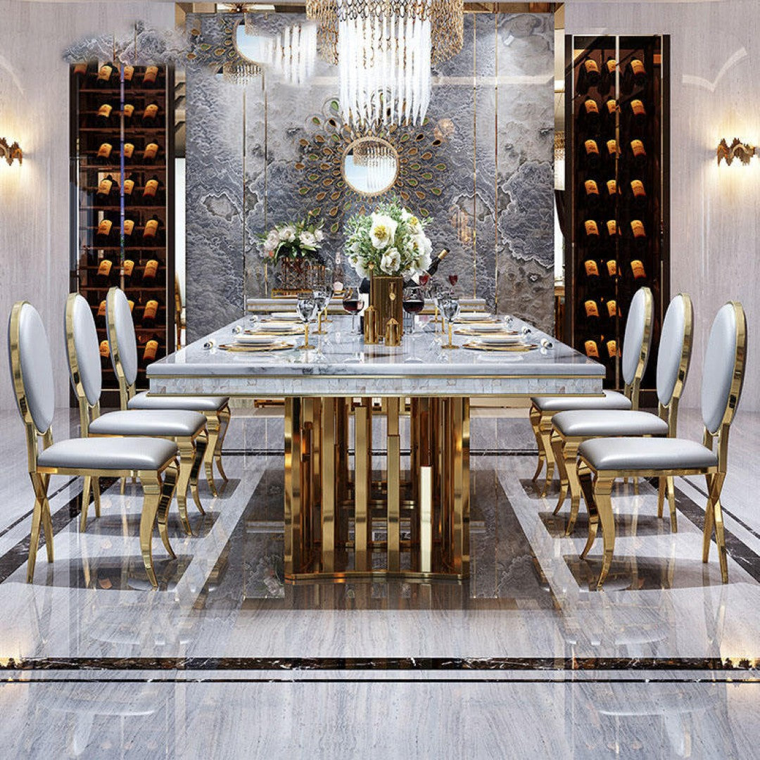 Luxury 8-Seater Marble Dining Table with Golden Stainless Steel Base & Oval Back Chairs