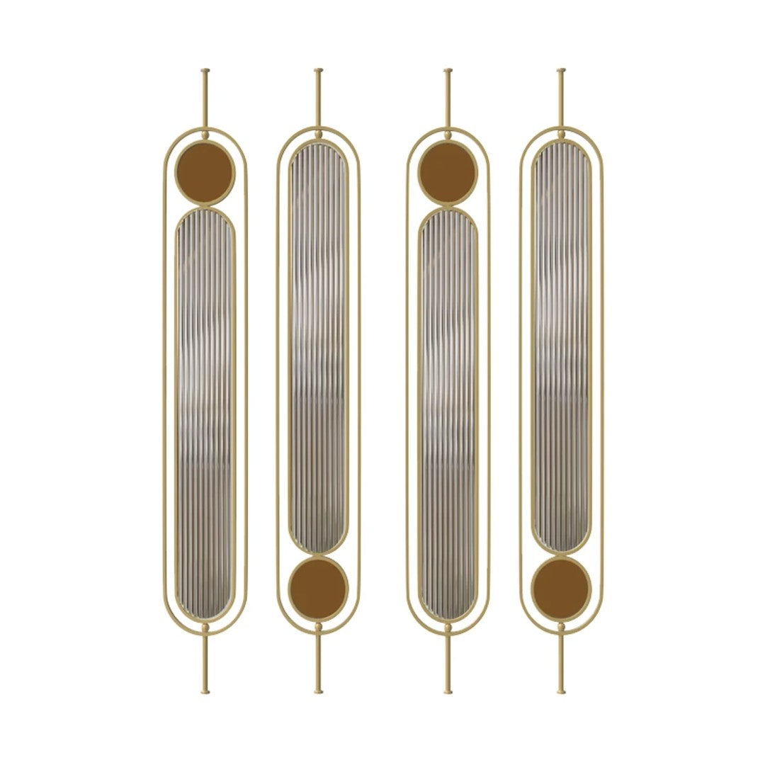 Bring elegance and sophistication to your interiors with this luxury art-deco style partition. Featuring slim golden frames with tall ribbed glass inserts, the design is elevated with circular accents on the top and bottom, creating a refined architectural statement. Ideal for modern living rooms, open layouts, or office spaces, this partition not only defines areas but also enhances light flow and aesthetics with its timeless art-deco influence.