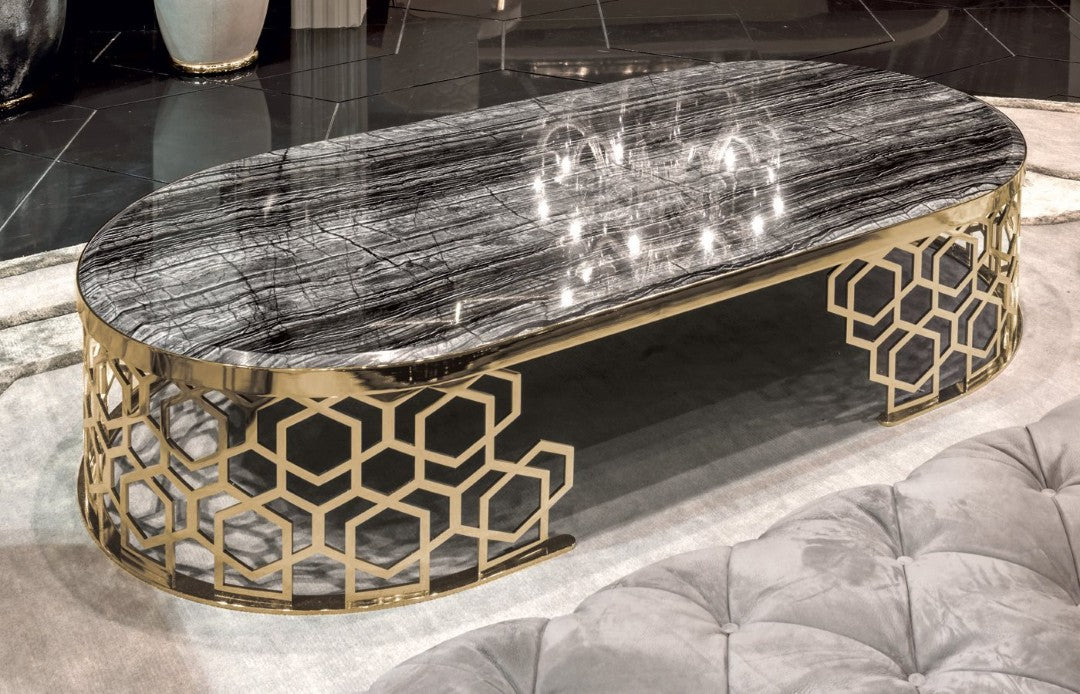 Elevate your living room with this luxury black marble coffee table, designed to be a true centerpiece. The bold black marble top, highlighted with natural veining, adds a rich and sophisticated touch, while the golden geometric cut-out base brings elegance and contemporary artistry. Its unique oval silhouette and intricate detailing make it an exceptional furniture piece for modern, luxurious interiors. Perfect for upscale homes, lounges, and designer spaces.