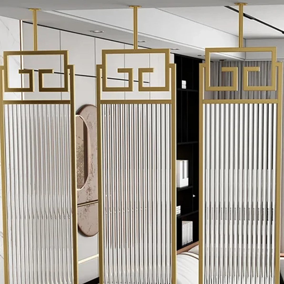 Bring timeless elegance to your interiors with this luxury gold partition featuring vertical fluted glass and iconic Greek key motifs. The combination of sleek glass panels with rich golden frames creates a perfect balance of modern minimalism and classical charm. Ideal as a room divider for living rooms, dining areas, or hallways, this partition enhances your space while maintaining an airy and open look. Its sturdy construction and luxurious finish make it a lasting centerpiece for contemporary and classic homes alike.