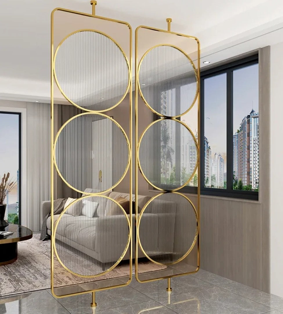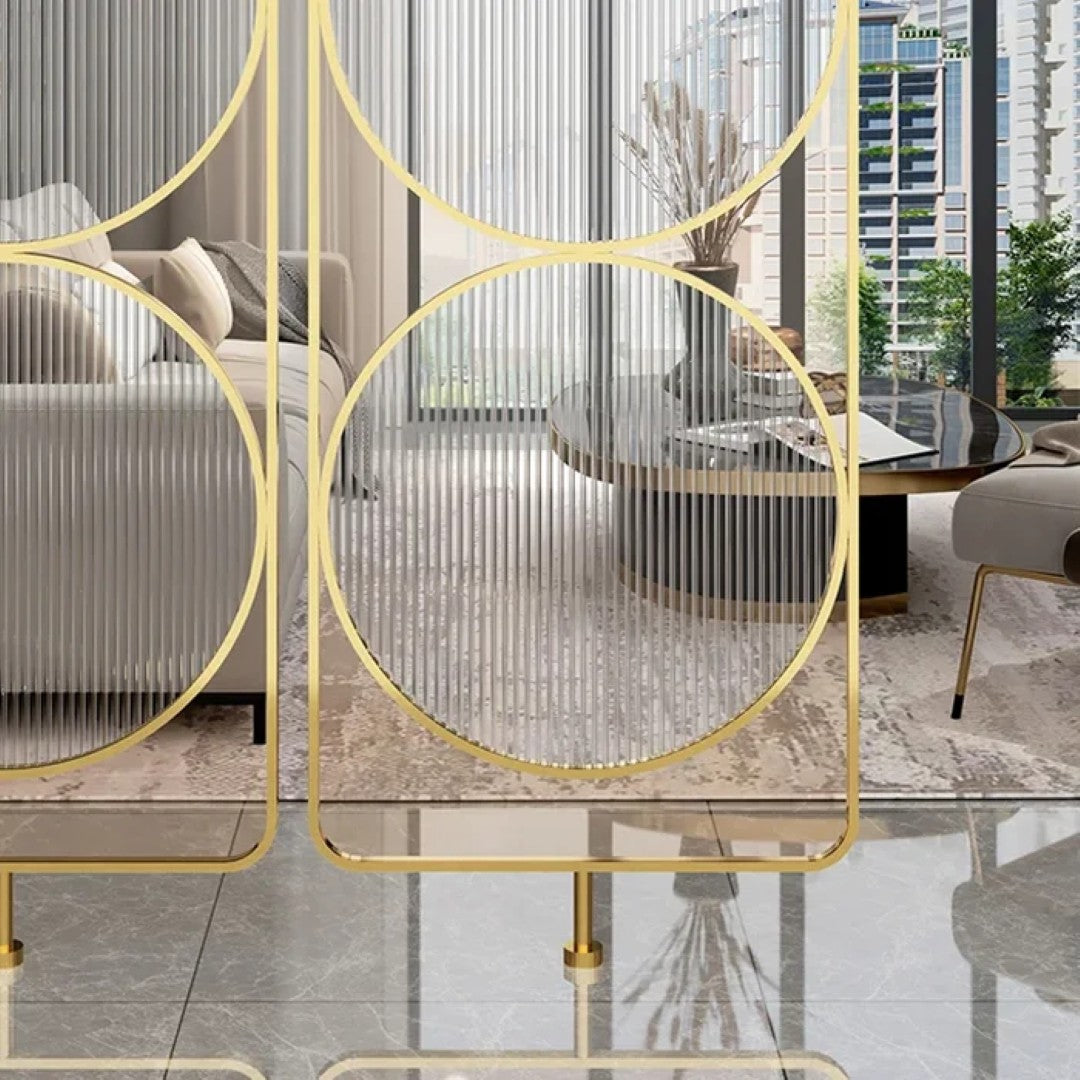 Add a bold artistic statement to your interiors with this luxury golden frame geometric room divider. Featuring four ribbed glass circles encased in a sleek rectangular frame, this partition blends modern design with timeless elegance. Ideal for separating living areas, dining spaces, or entryways, it not only provides functionality but also elevates your home or commercial space with a unique, eye-catching aesthetic.