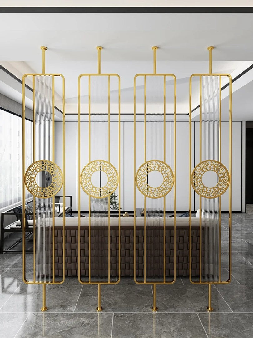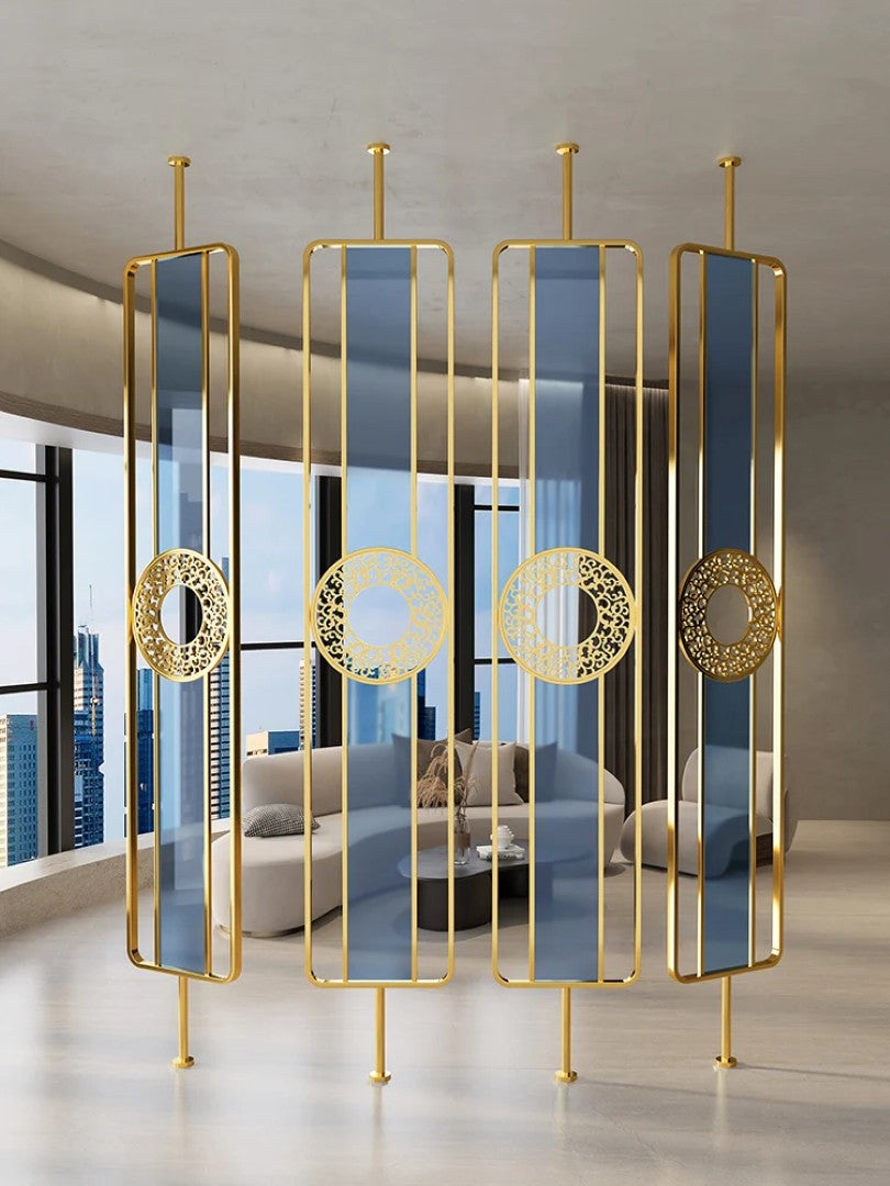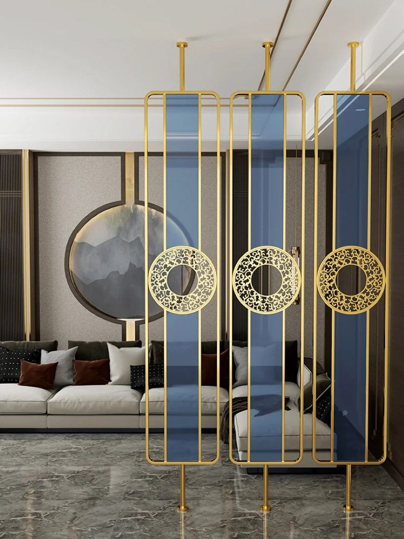 Add a touch of sophistication and modern elegance to your interiors with this luxury room divider. Crafted with golden metal framing and sleek blue glass panels, the divider features an intricate ornamental circular design at the center. Perfect for separating spaces in living rooms, lounges, or offices while maintaining an open and stylish look. This statement piece combines functionality with art, elevating any contemporary décor.