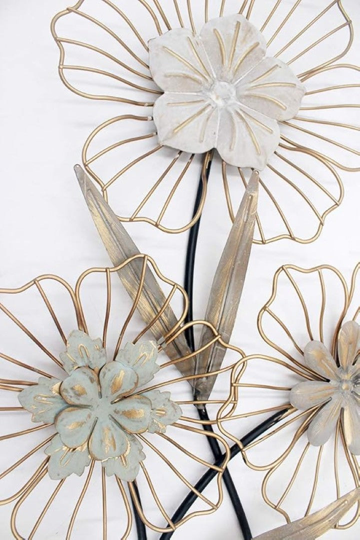 Bring a touch of elegance and charm to your walls with this floral wire frame metal wall art. Featuring three beautifully detailed flowers crafted from lightweight metal with golden outlines and soft accents, this piece adds warmth and style to any space. Its slim design makes it ideal for compact areas like bathrooms, hallways, or entryways, while still working as a statement piece in bedrooms or living rooms. Durable and easy to hang, it blends rustic and modern décor seamlessly