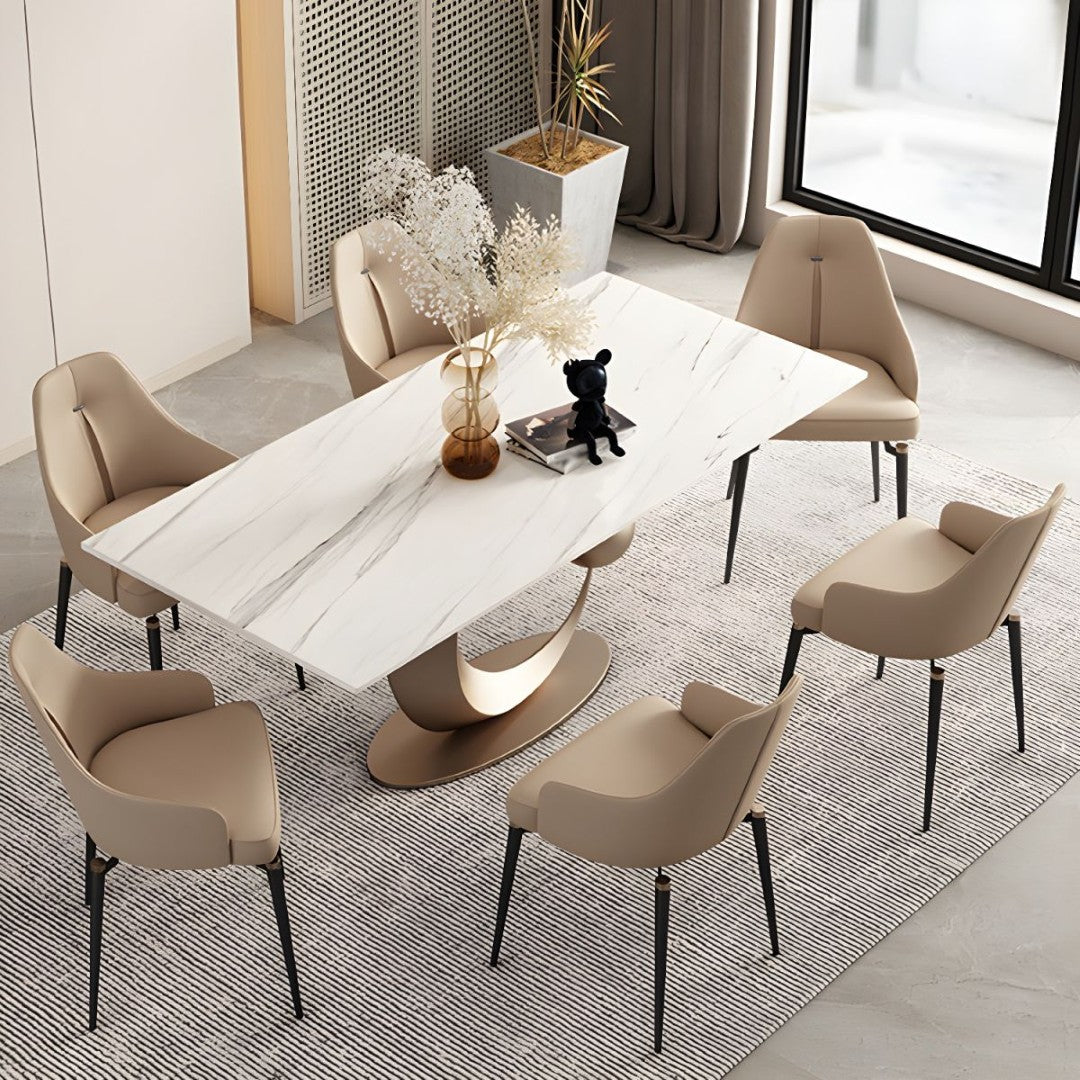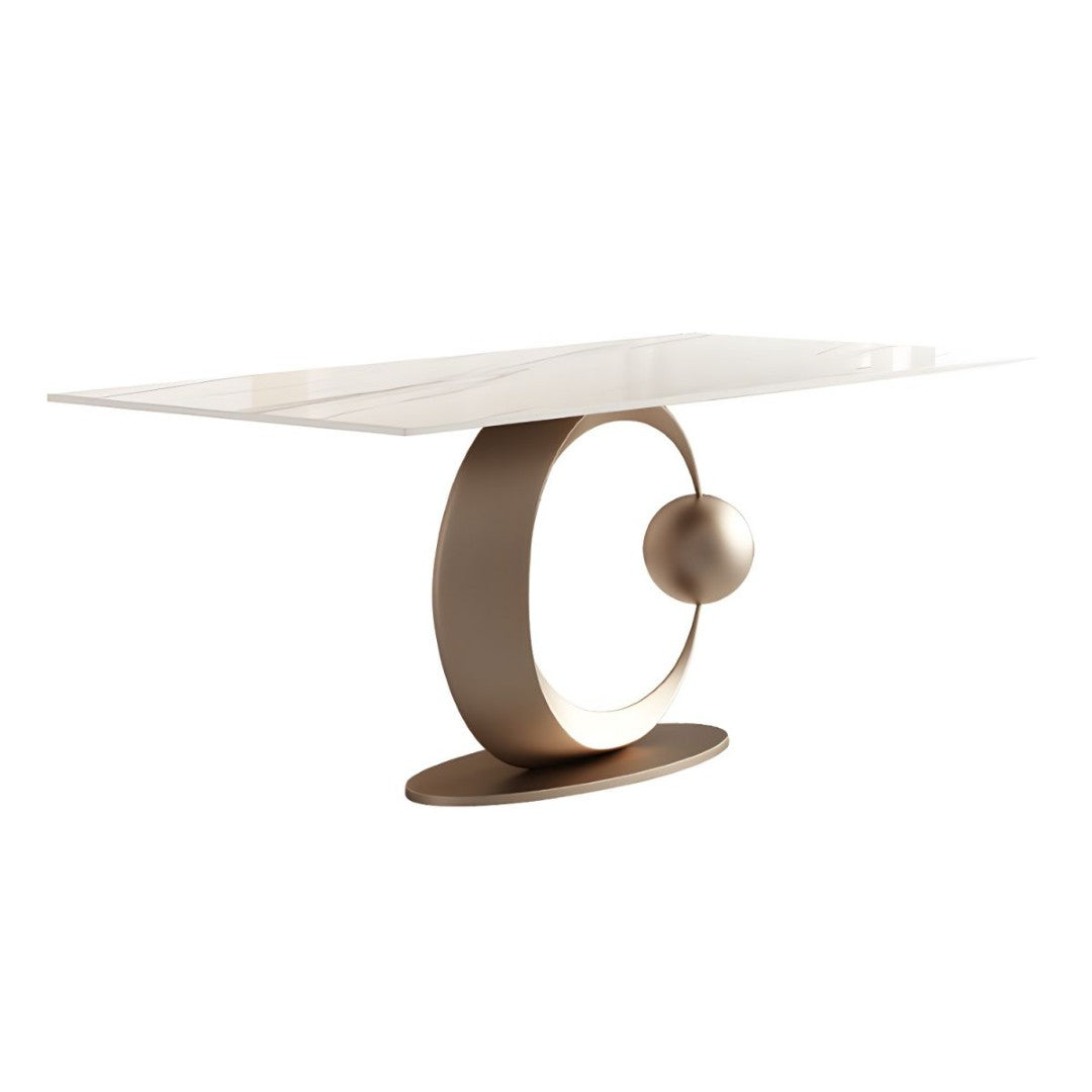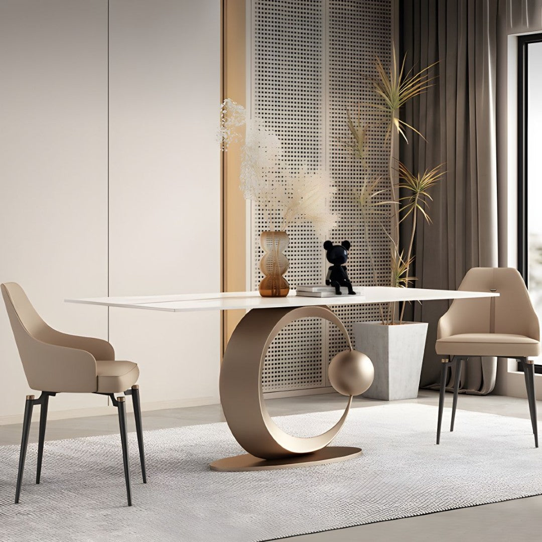 Bring home a bold statement of modern art and design with this luxury dining table set. Featuring a rectangular white tabletop with a smooth marble-inspired finish, the table stands on a stunning golden sculptural base shaped like a circle with a suspended sphere, making it both functional and artistic. Paired with four beige upholstered chairs with sleek black-gold legs, this dining set creates a perfect balance of sophistication and contemporary flair. Ideal for stylish apartments, designer homes, or modern dining spaces.