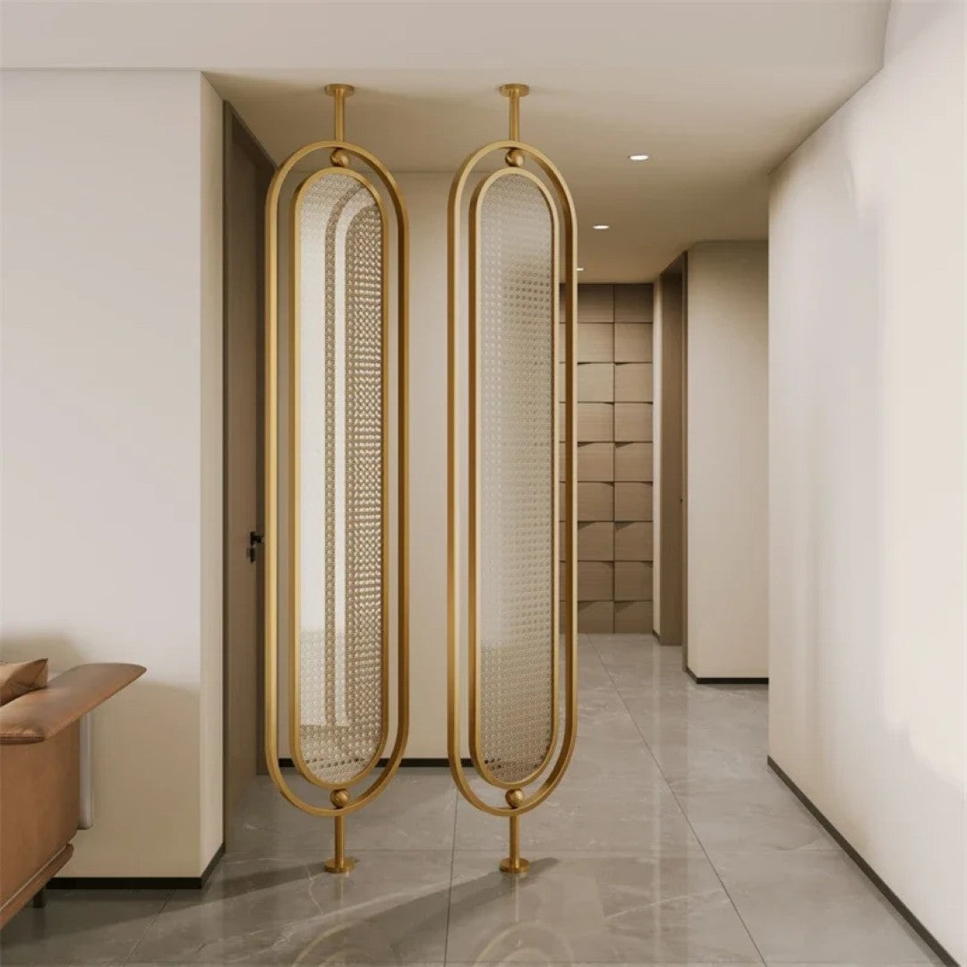 Bring natural elegance and modern design together with this black frame rattan weave partition. Featuring elongated oval cane panels encased in a sleek black metal frame, this partition adds warmth and texture to any space. Ideal for living rooms, studios, or open layouts, it creates a semi-private division while maintaining light and airflow. Its unique fusion of industrial black metal and organic rattan makes it a standout piece for luxury, bohemian, or contemporary interiors.
