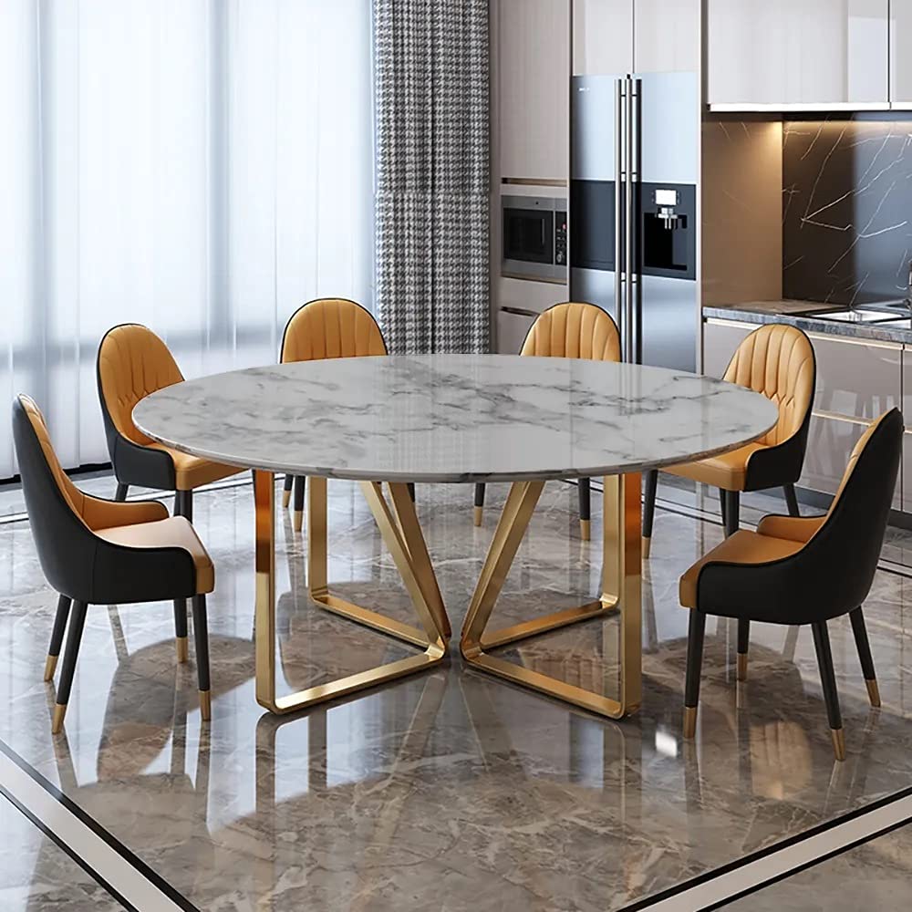 Upgrade your dining space with this stunning 6-seater round dining set featuring a premium white marble tabletop and a modern golden stainless steel base. The bold mustard and black cushioned chairs add a touch of elegance and comfort, making it ideal for family dinners, get-togethers, or stylish interiors. This round marble dining table is not only durable but also a centerpiece that enhances the luxury appeal of your home.