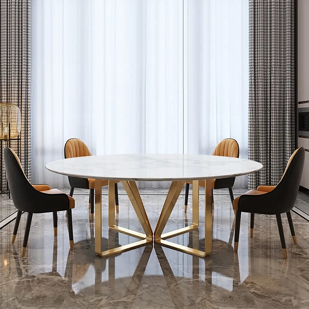 Round White Marble Dining Table with Golden Base & Mustard-Black Chairs (6-Seater)