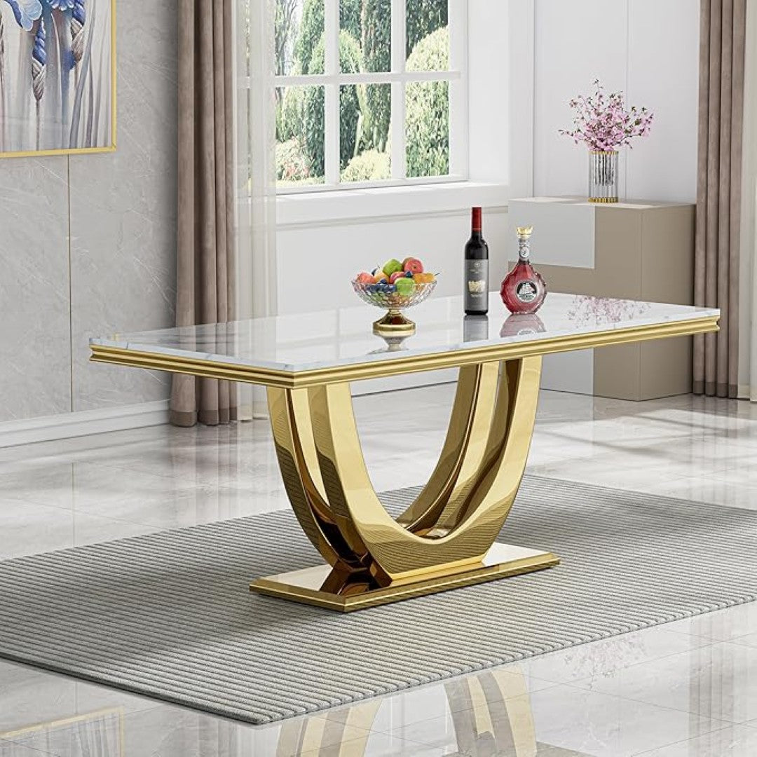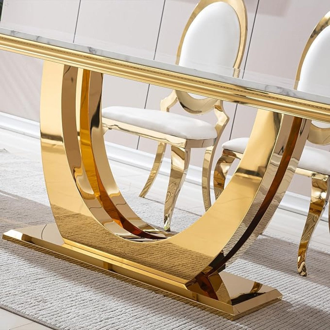 Add timeless elegance to your dining room with this 6-seater luxury dining set. Featuring a rectangular white marble tabletop supported by a unique golden stainless steel U-shaped base, this table combines strength with sophistication. The set includes high-back cushioned chairs in white upholstery with golden accents, offering both comfort and royal aesthetics. Perfect for hosting formal dinners, family meals, or adding a statement piece to your home décor.